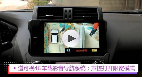 三維限寬模式:在此模式下,車主能輕松直觀的查看車身與障礙物的距離。以道可視推出的搭載了360°全景輔駕的“4G車載影音導航系統(tǒng)”為例,可以通過語音聲控“打開全景”讓中控屏呈現(xiàn)360°全景畫面。在打開全景功能后,再一次發(fā)出“打開全景”的聲控指令,就可以切換到“三維限寬模式”,幫助用戶順利的通過狹窄路段。