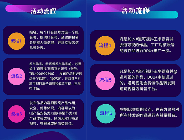 流程4:凡是加入#道可視抖王爭霸賽并@道可視的作品,工廠對該賬號的該作品進(jìn)行DOU+推廣一次。