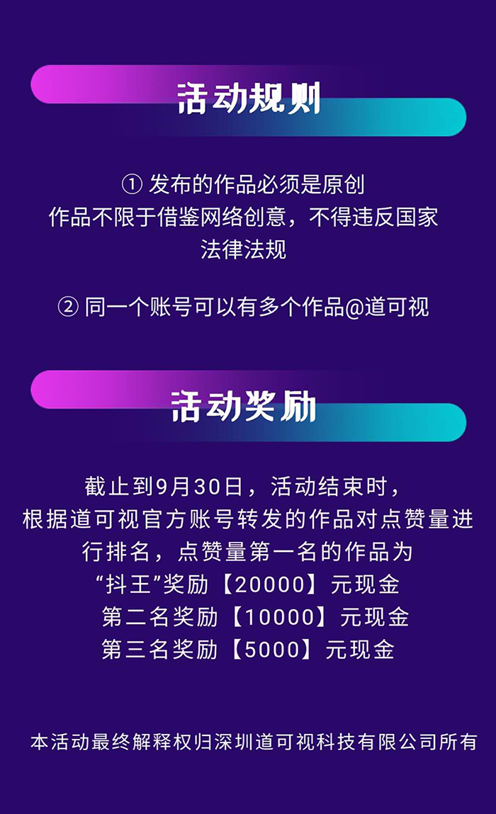 敢,你就來!有創(chuàng)意、有思維的你,一起參與2020道可視“抖王”爭霸賽贏取萬元現(xiàn)金大獎(jiǎng)!下一個(gè)道可視“抖王”就是你!一起抖起來吧??!