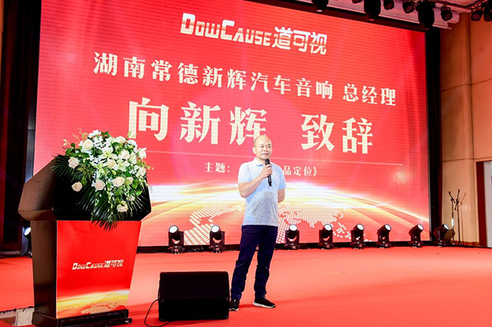 湖南常德新輝汽車音響總經理向新輝上臺發言,他以自身多年門店運營經驗,為嘉賓帶來“門店產品定位”的主題分享。